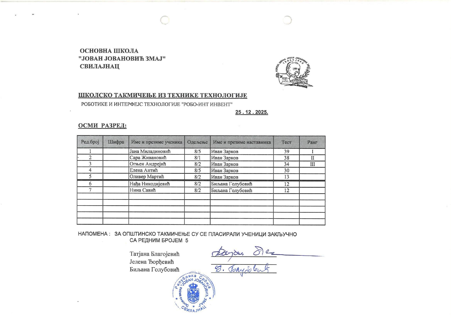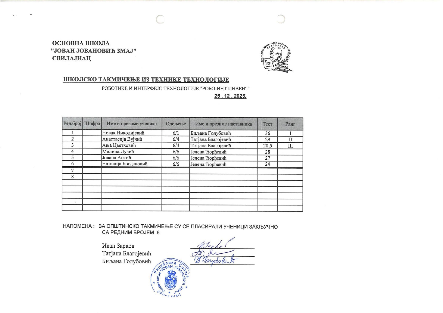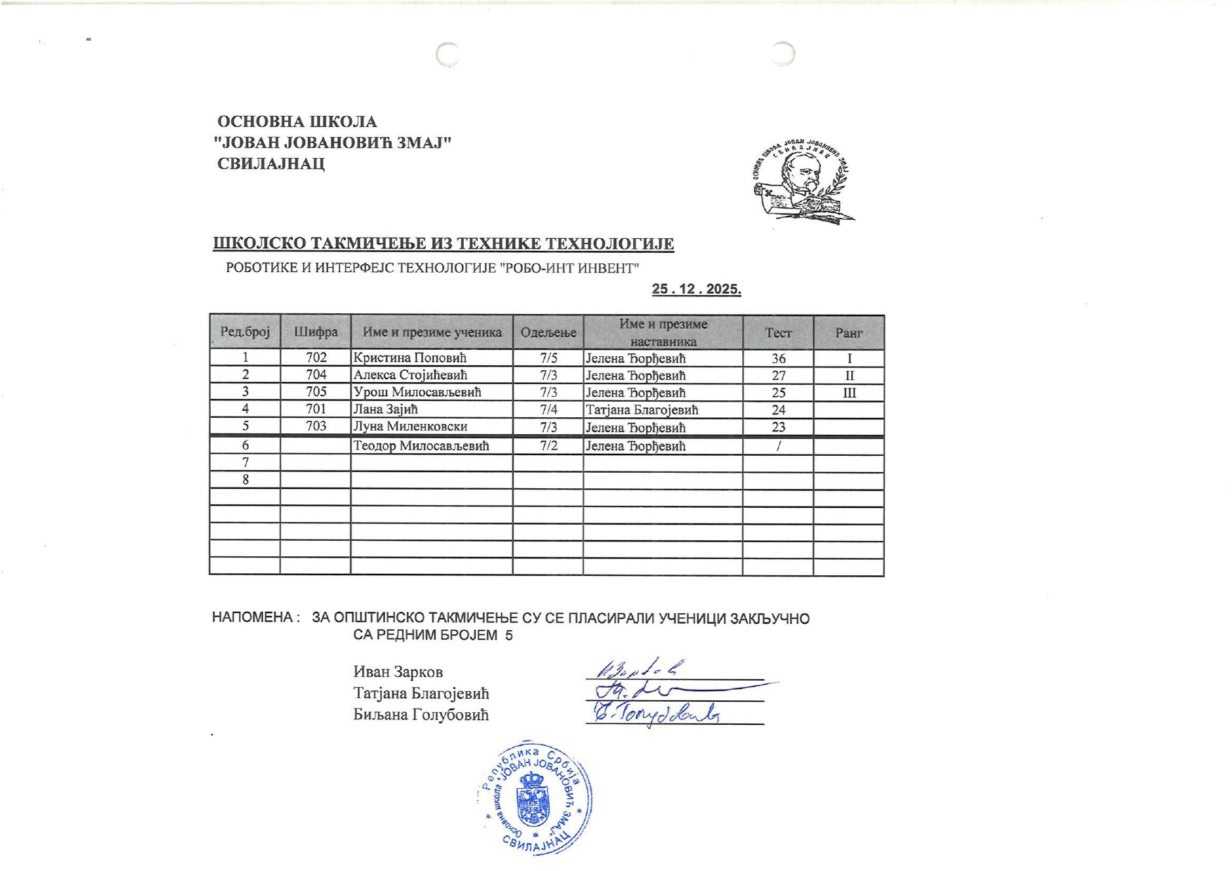 Резултати са Школског такмичења из технике и технологије и школског нивоа такмичења „ROBO-INT Invent“ od strane Александар Јовановић | дец 26, 2025 | а 2026, о 2026, т 2026, такмичење - школско Резултати са Школског такмичења из технике и технологије и школског нивоа такмичења „ROBO-INT Invent“26/12/2025 🔊 Читај ми У наставку можете погледати резултате са Школског такмичења из технике и технологије, као и резултате са школског нивоа такмичења „ROBO-INT Invent“ Техника и технологија „ROBO-INT Invent“