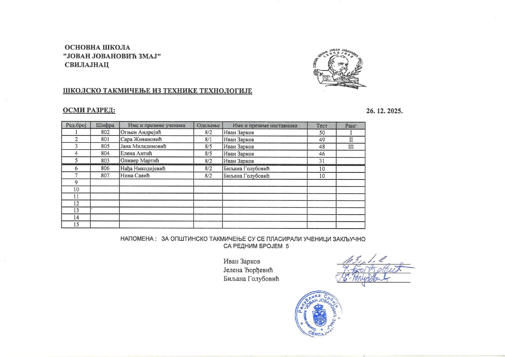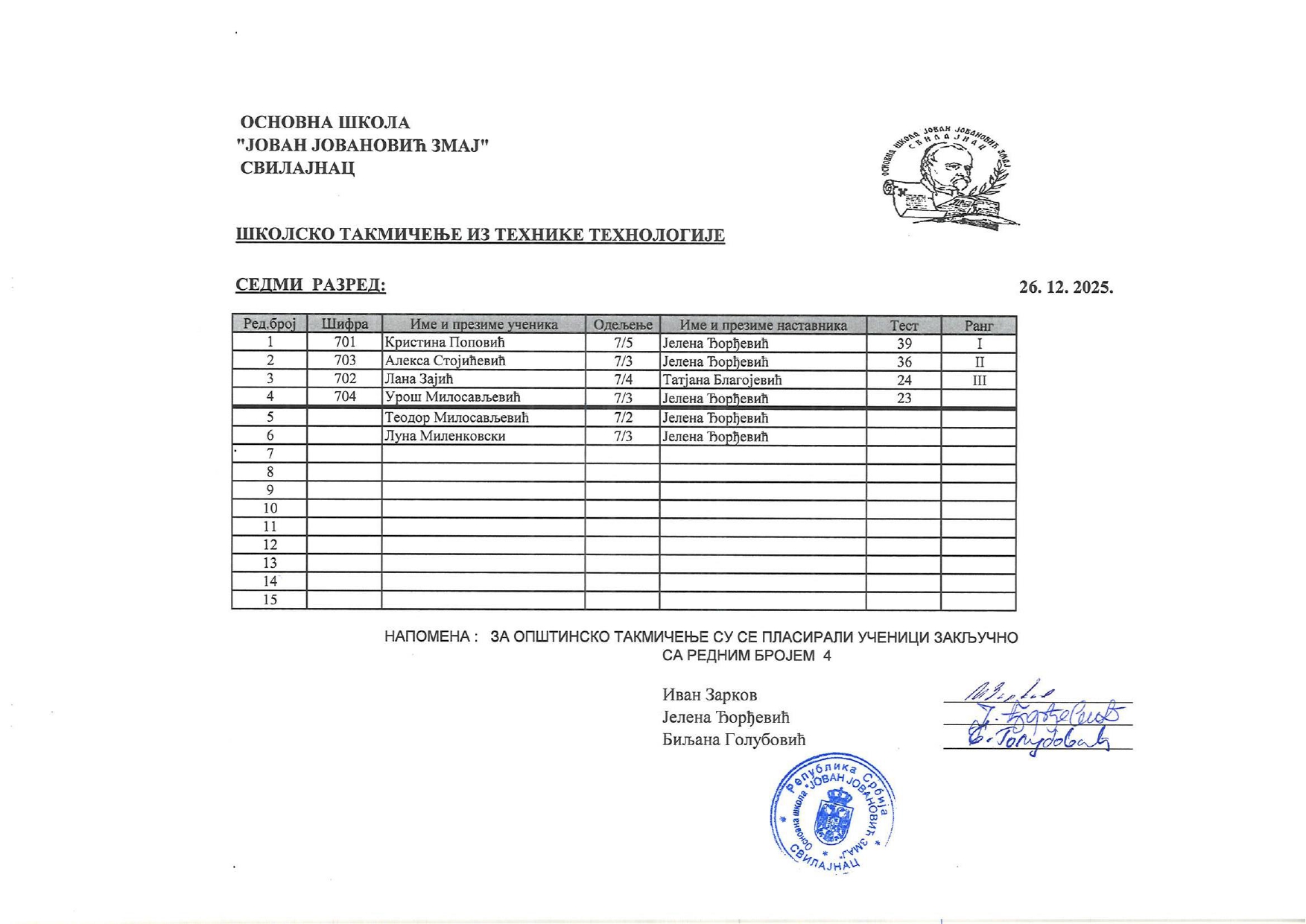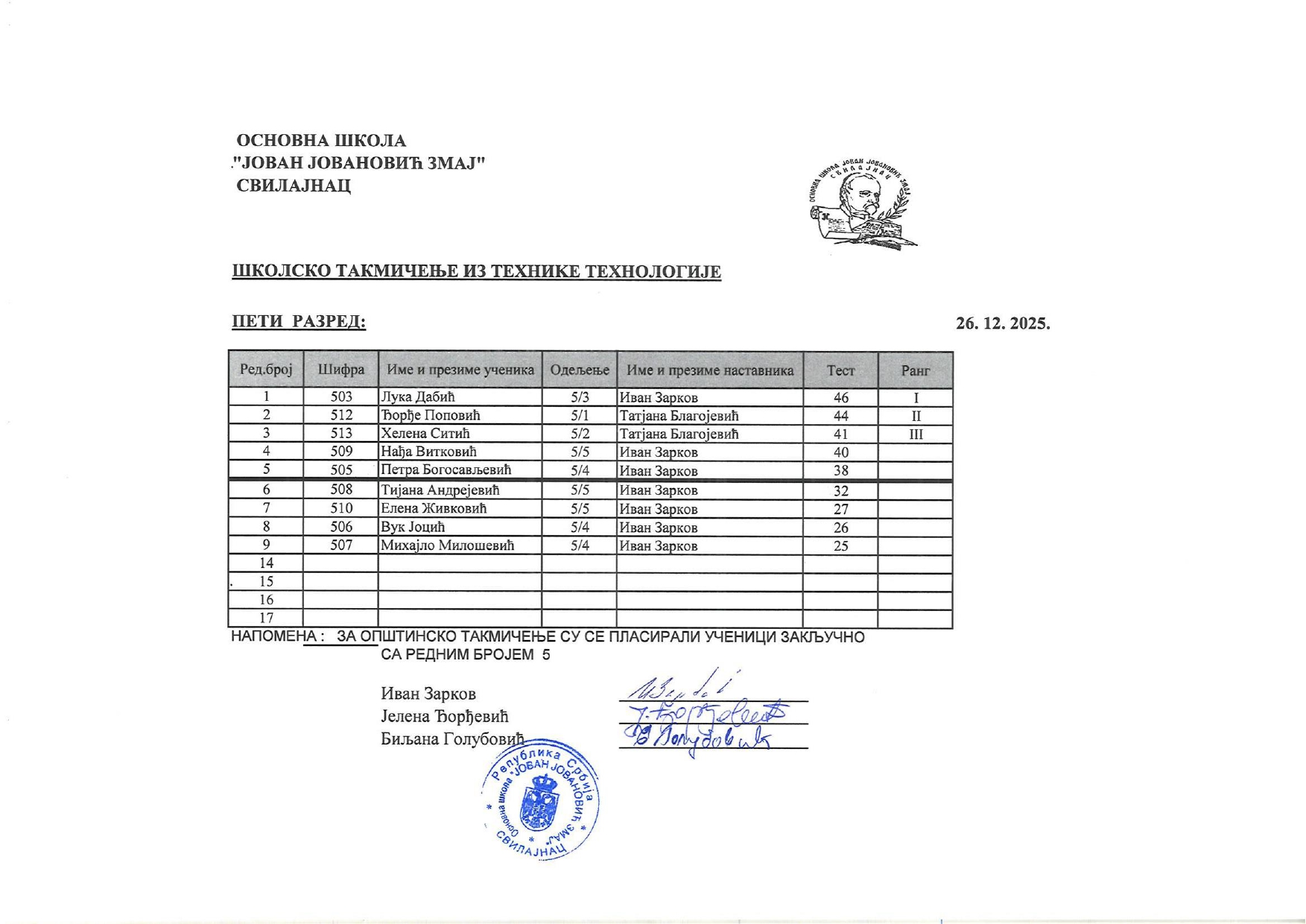 Резултати са Школског такмичења из технике и технологије и школског нивоа такмичења „ROBO-INT Invent“ od strane Александар Јовановић | дец 26, 2025 | а 2026, о 2026, т 2026, такмичење - школско Резултати са Школског такмичења из технике и технологије и школског нивоа такмичења „ROBO-INT Invent“26/12/2025 🔊 Читај ми У наставку можете погледати резултате са Школског такмичења из технике и технологије, као и резултате са школског нивоа такмичења „ROBO-INT Invent“ Техника и технологија „ROBO-INT Invent“