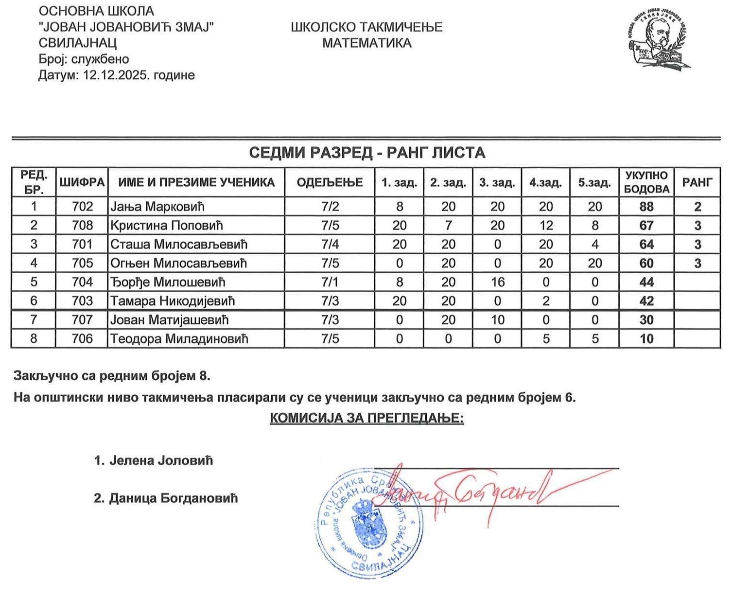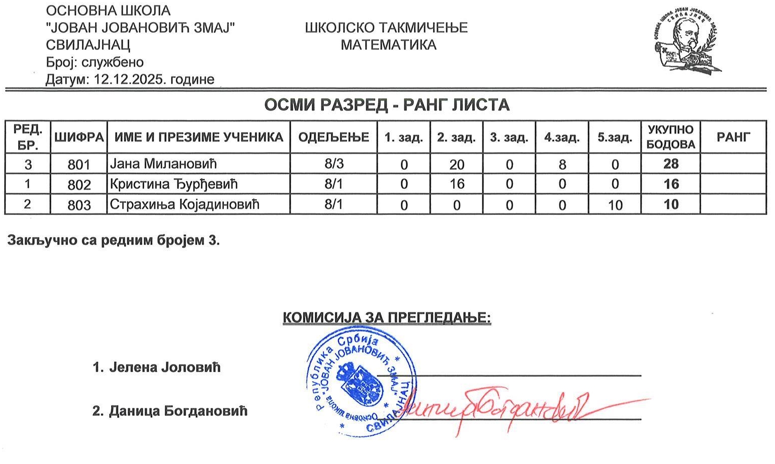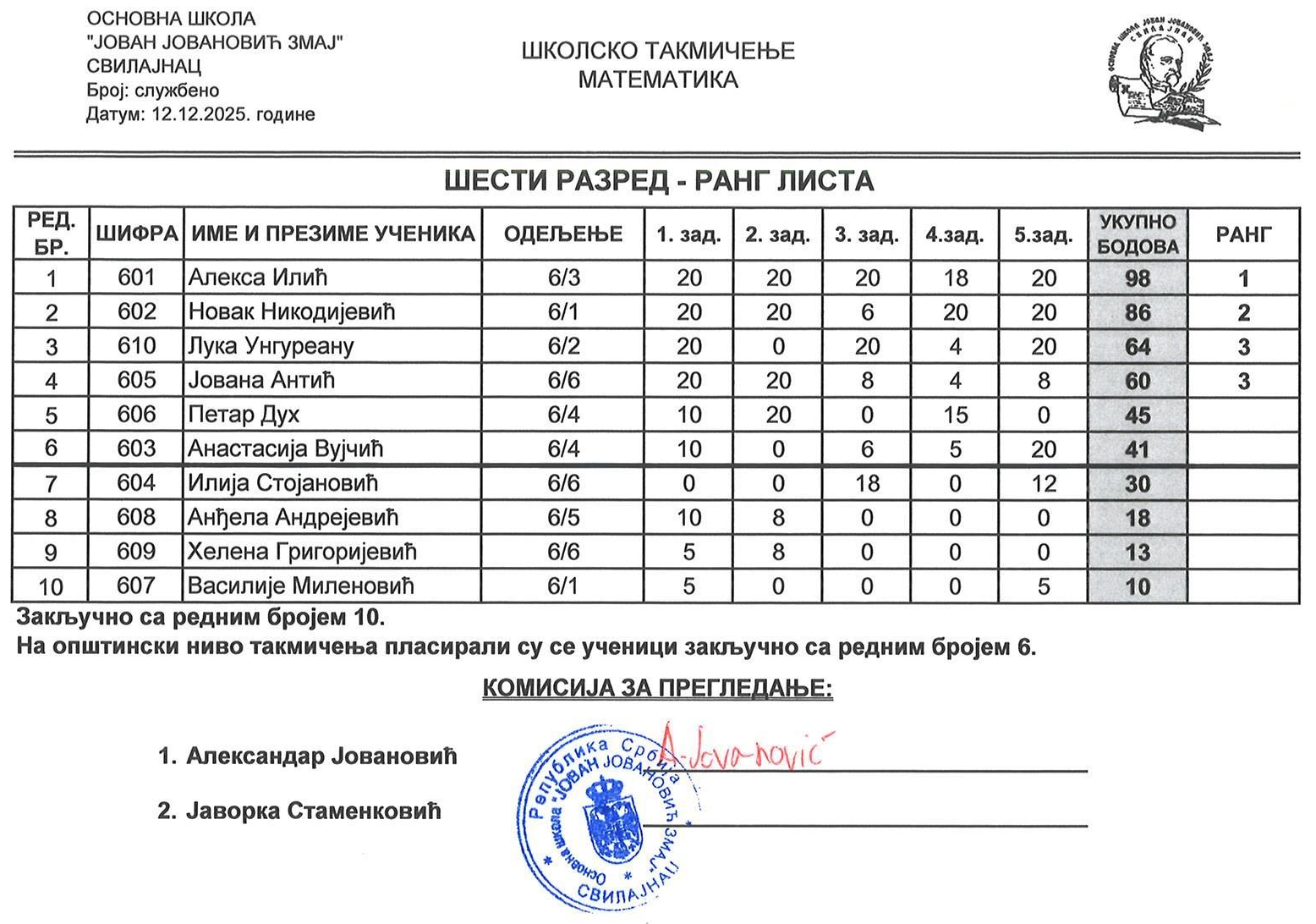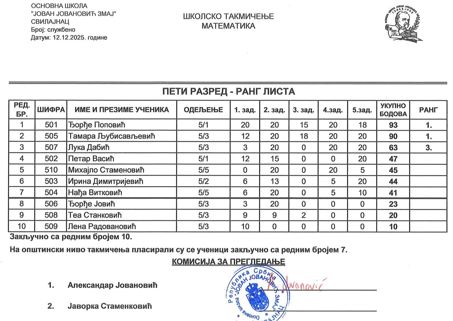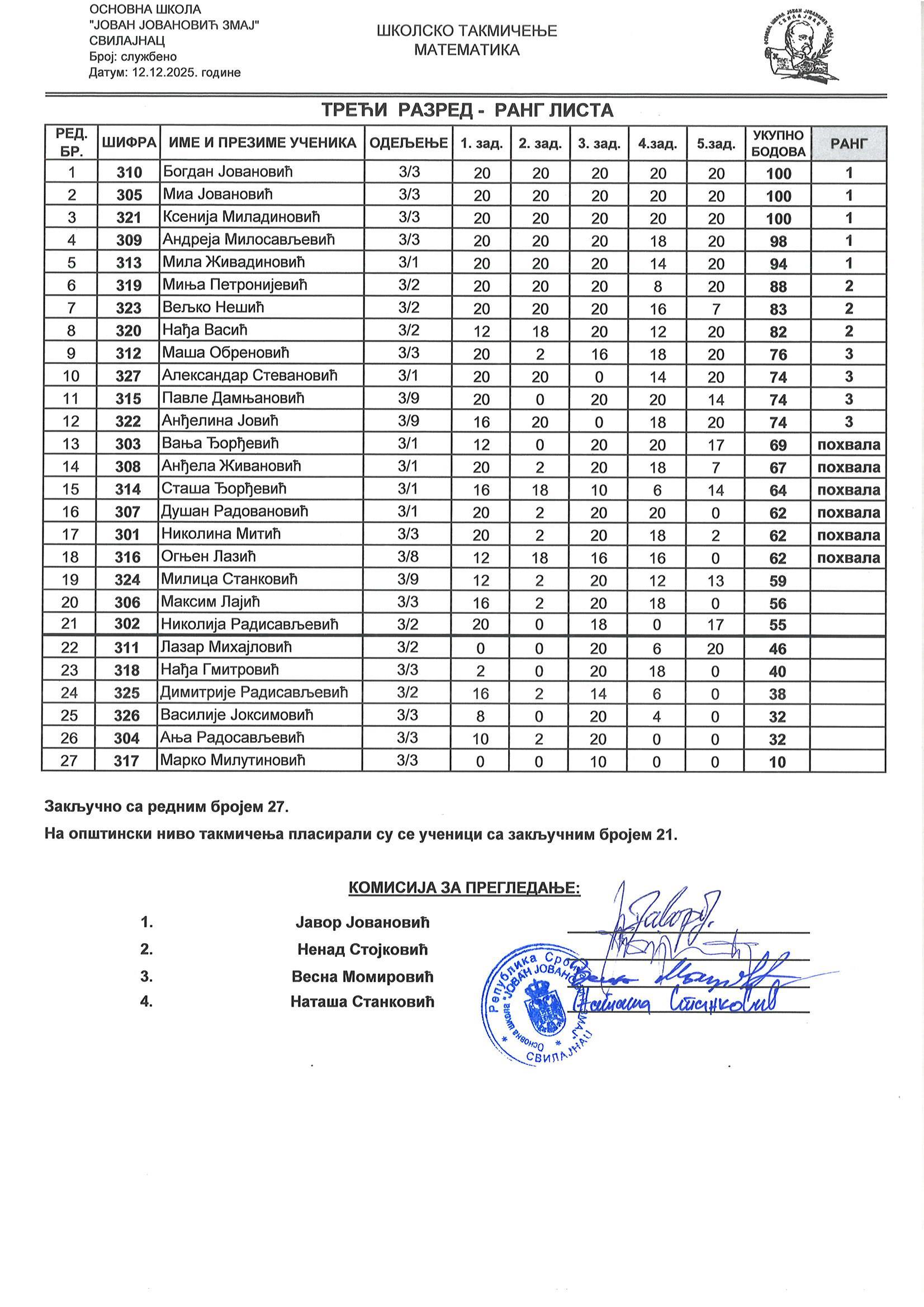 Школско такмичење из математике 2025/2026 od strane Александар Јовановић | дец 12, 2025 | т 2026, такмичење Школско такмичење из математике 2025/202612/12/2025 🔊 Читај ми У наставку можете погледати резултате са Школског такмичења из математике од 3. до 8. разреда.