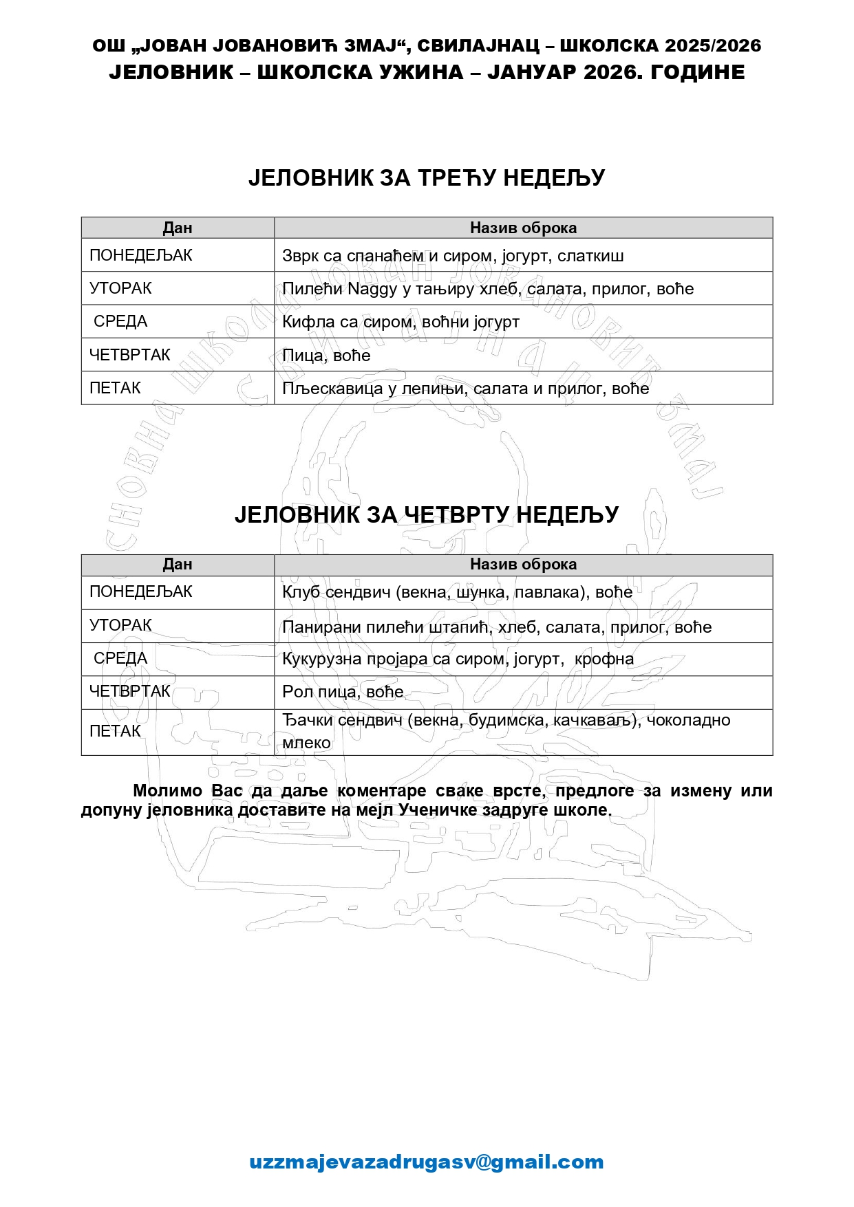 Јеловник за јануар od strane Александар Јовановић | јан 19, 2026 | а 2026, о 2026 Јеловник за јануар19/01/2026 🔊 Читај ми У наставку можете погледати јеловник за јануар.