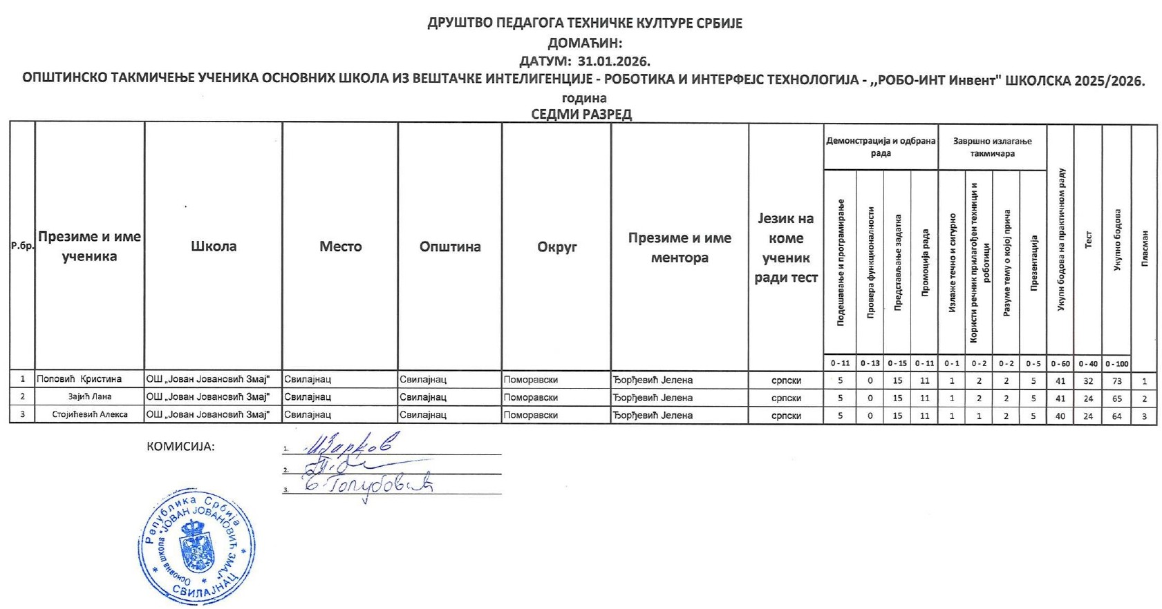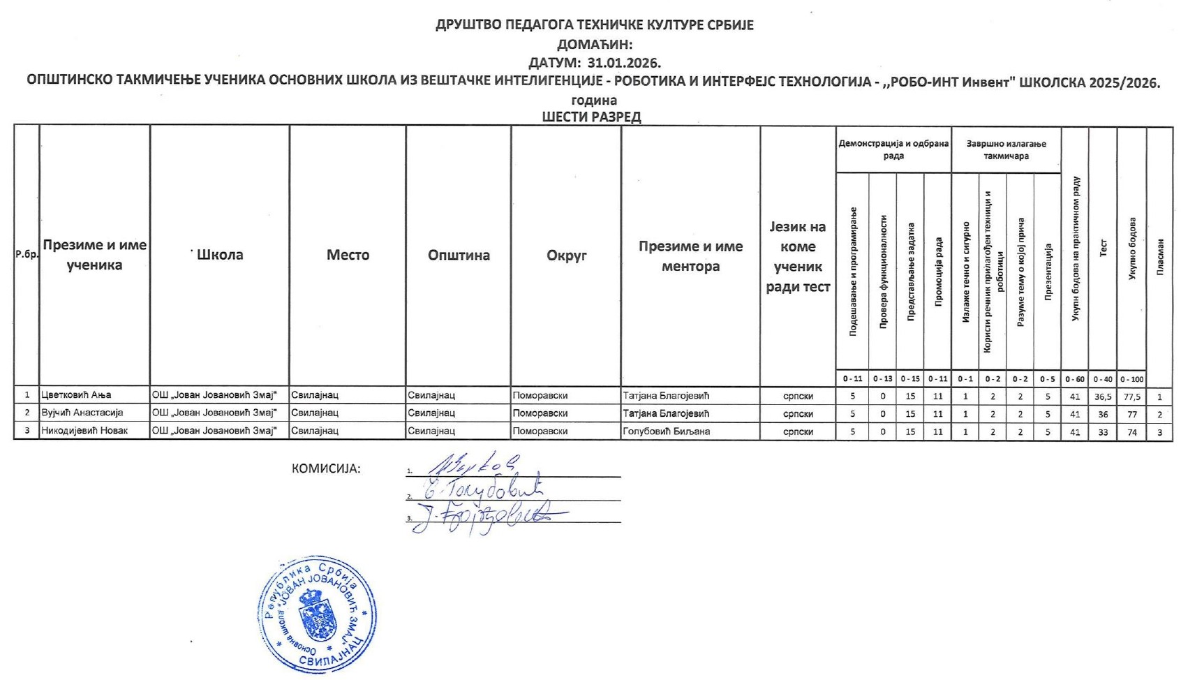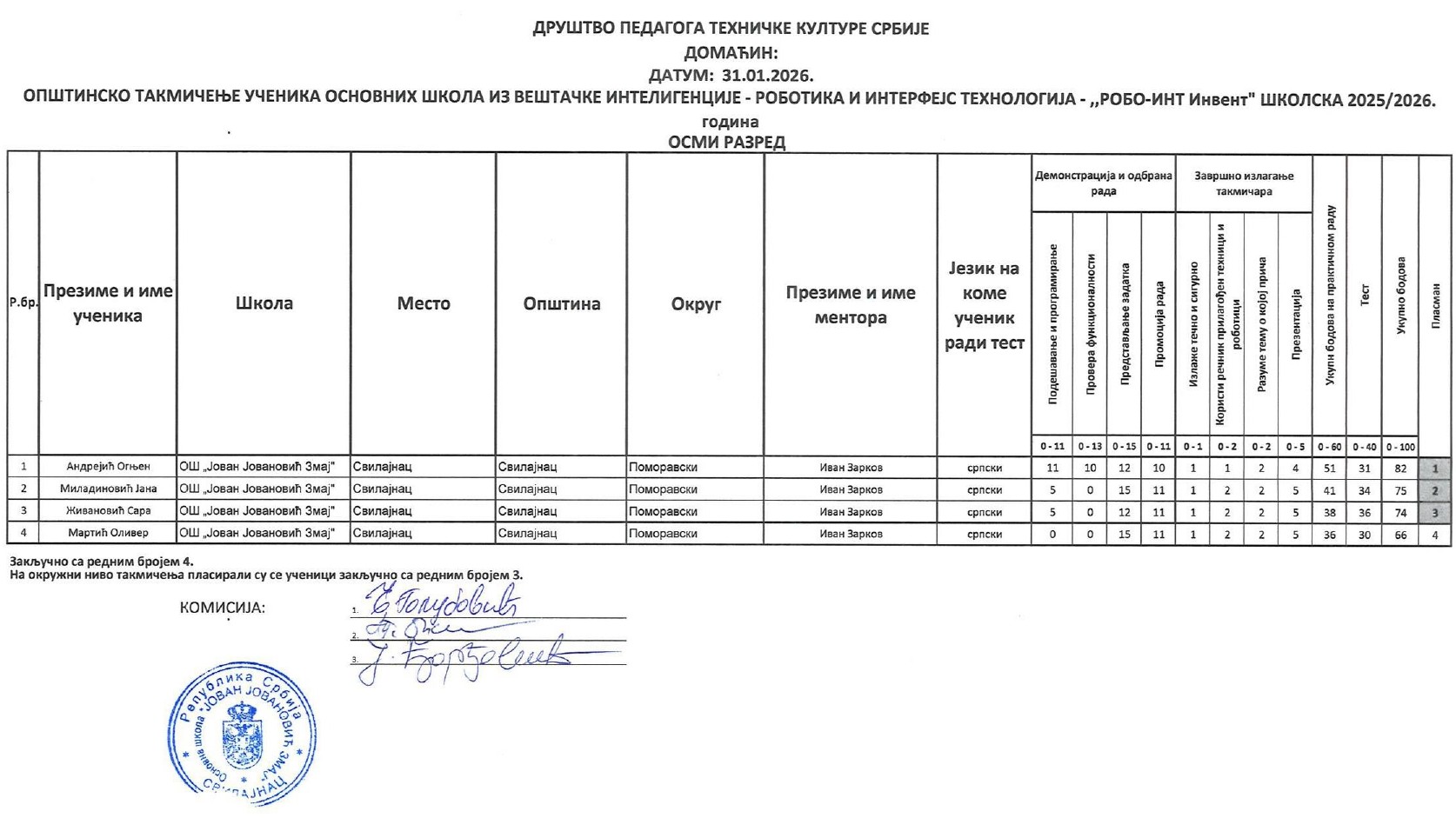 Резултати са Општинског такмичења из роботике и интерфејс технологије „ROBO-INT Invent“ 2025/2026. od strane Александар Јовановић | јан 31, 2026 | а 2026, о 2026, т 2026, такмичење - општинско Резултати са Општинског такмичења из роботике и интерфејс технологије „ROBO-INT Invent“ 2025/2026.31/01/2026 🔊 Читај ми У наставку можете погледати резултате са Општинског такмичења из роботике и интерфејс технологије „ROBO-INT Invent“