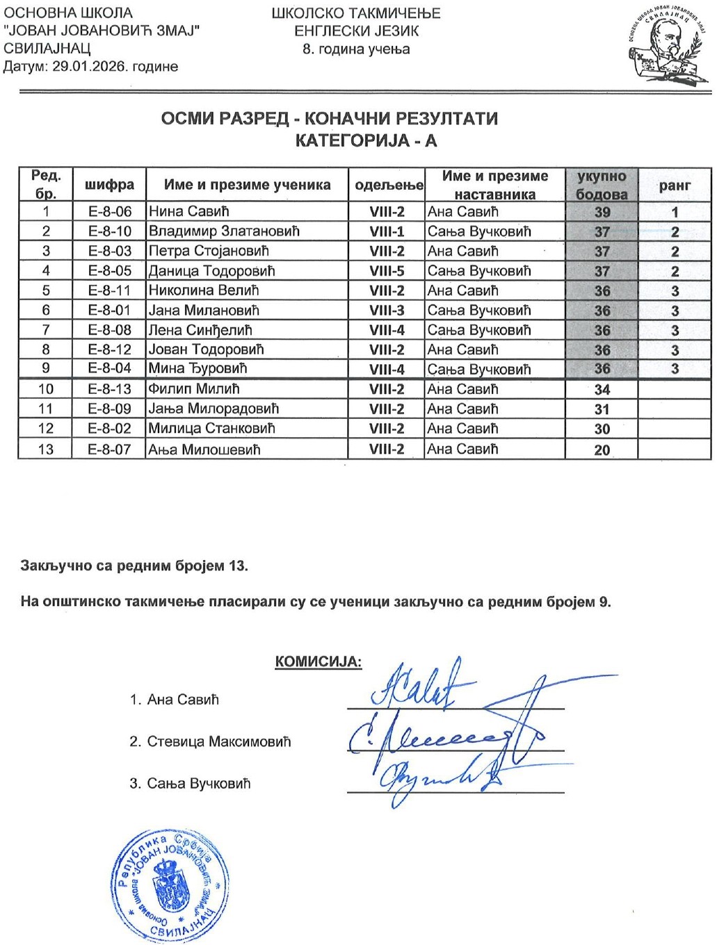 Резултати са Школског такмичења из енглеског језика 2025/2026. od strane Александар Јовановић | јан 29, 2026 | а 2026, о 2026, т 2026, такмичење - школско Резултати са Школског такмичења из енглеског језика 2025/2026.29/01/2026 🔊 Читај ми У наставку можете погледати резултате са Школског такмичења из енглеског језика.