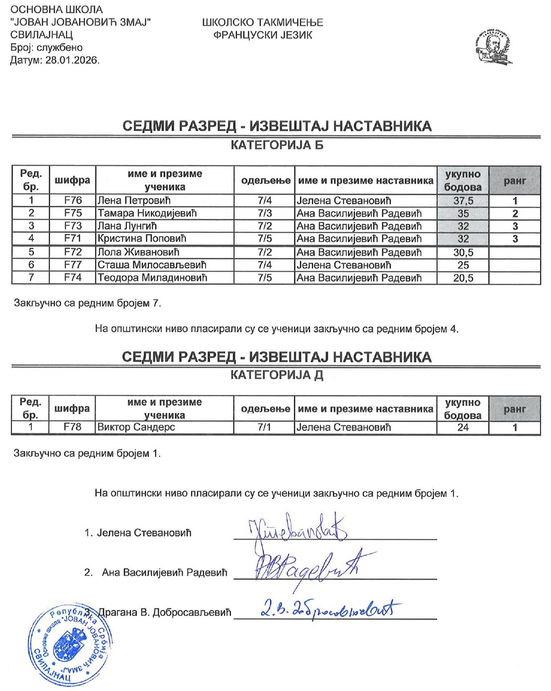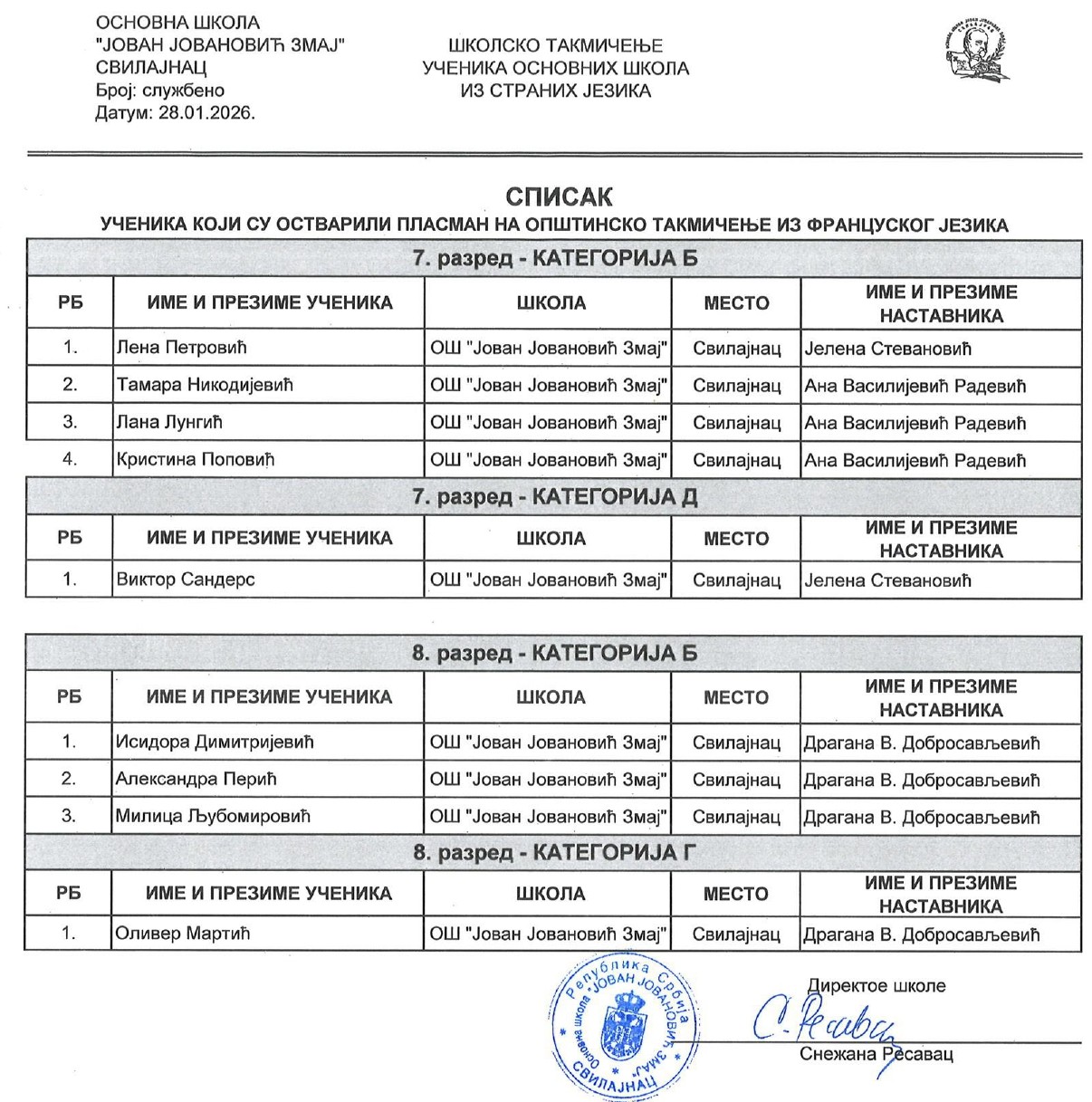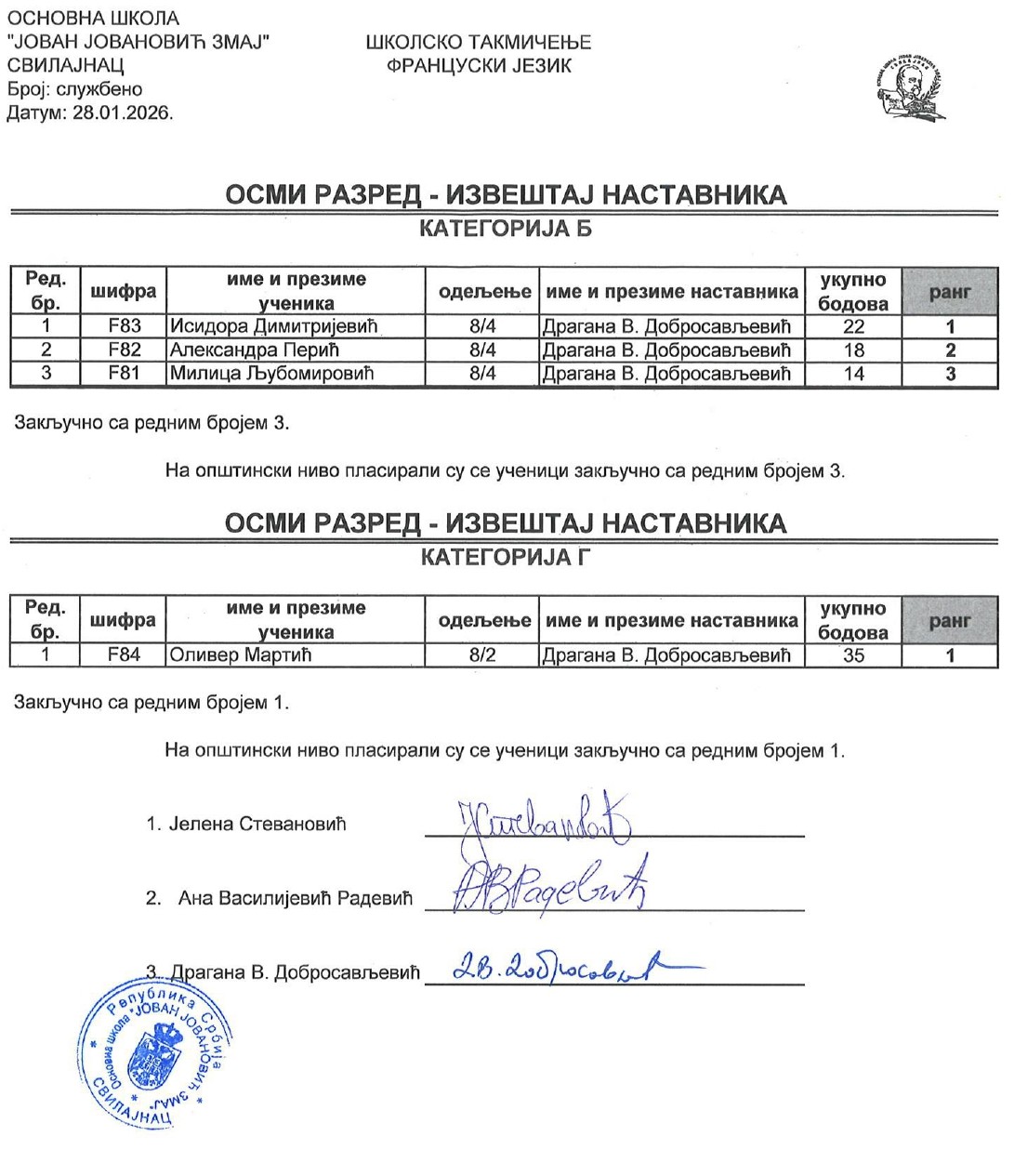 Резултати са Школског такмичења из француског језика 2025/2026. od strane Александар Јовановић | јан 28, 2026 | а 2026, о 2026, т 2026, такмичење - школско Резултати са Школског такмичења из француског језика 2025/2026.28/01/2026 🔊 Читај ми У наставку можете погледати резултате са Школског такмичења из француског језика.