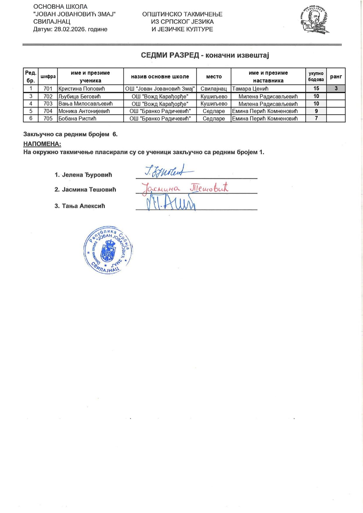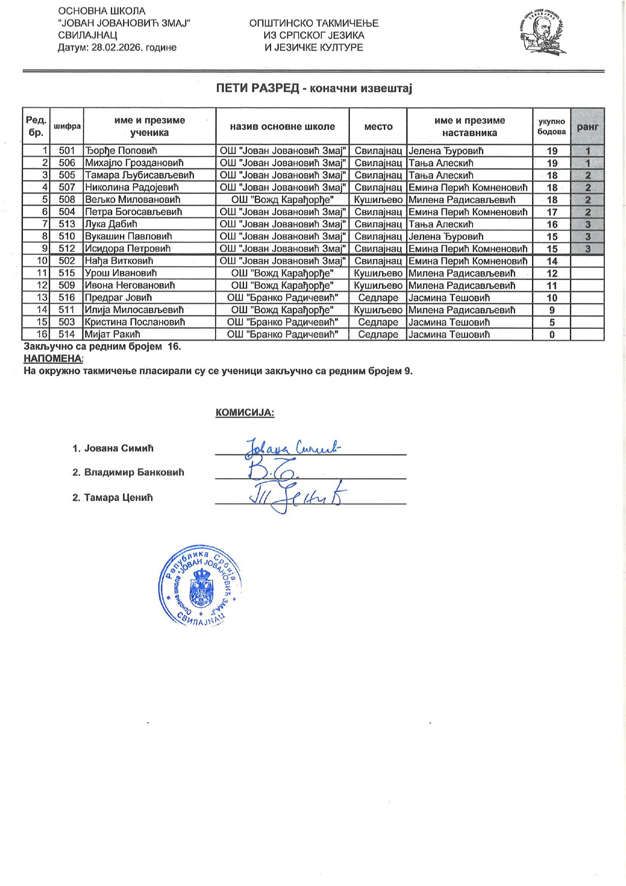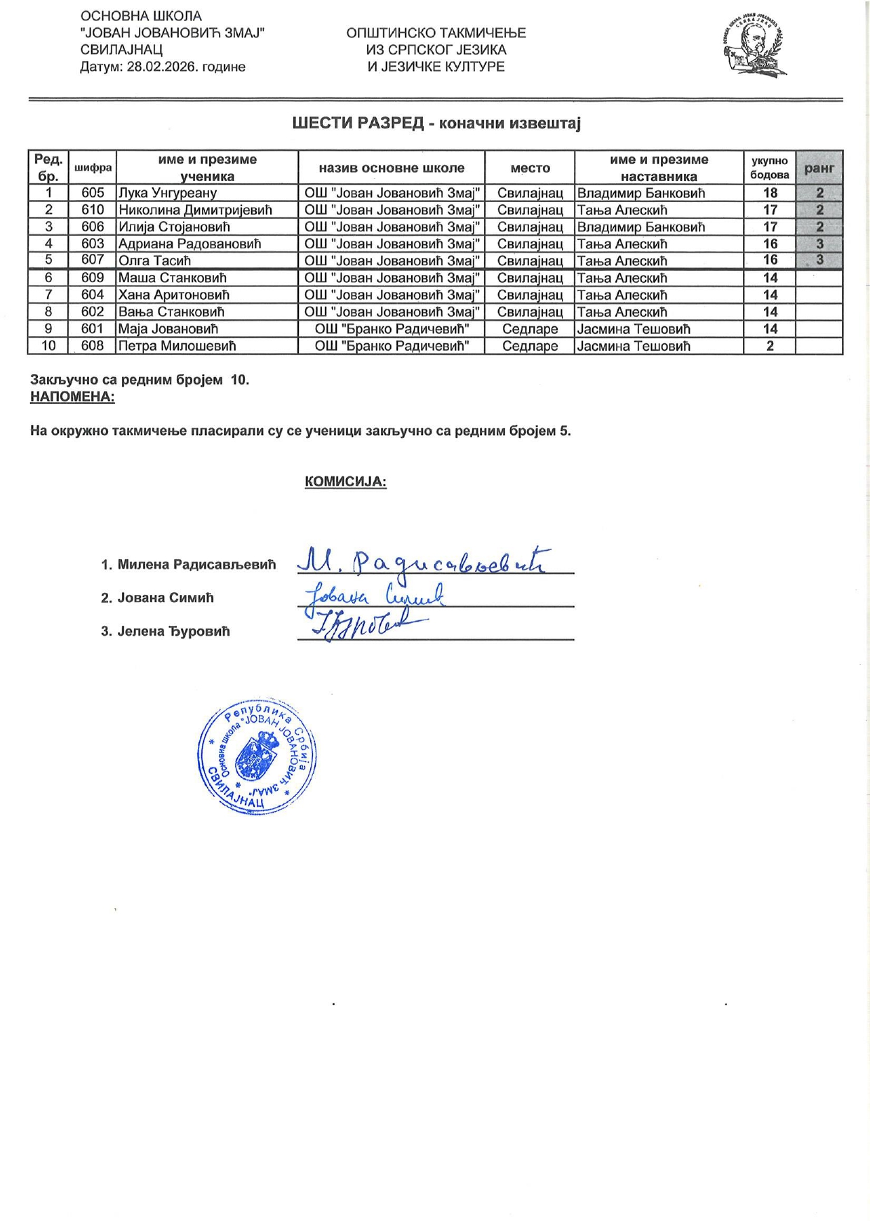 Резултати са Општинског такмичења из српског језика и књижевности 2025/2026 od strane Александар Јовановић | феб 28, 2026 | а 2026, о 2026, т 2026, такмичење - општинско Резултати са Општинског такмичења из српског језика и књижевности 2025/202628/02/2026 🔊 Читај ми У наставку можете погледати резултате са Општинског такмичења из српског језика и књижевности.