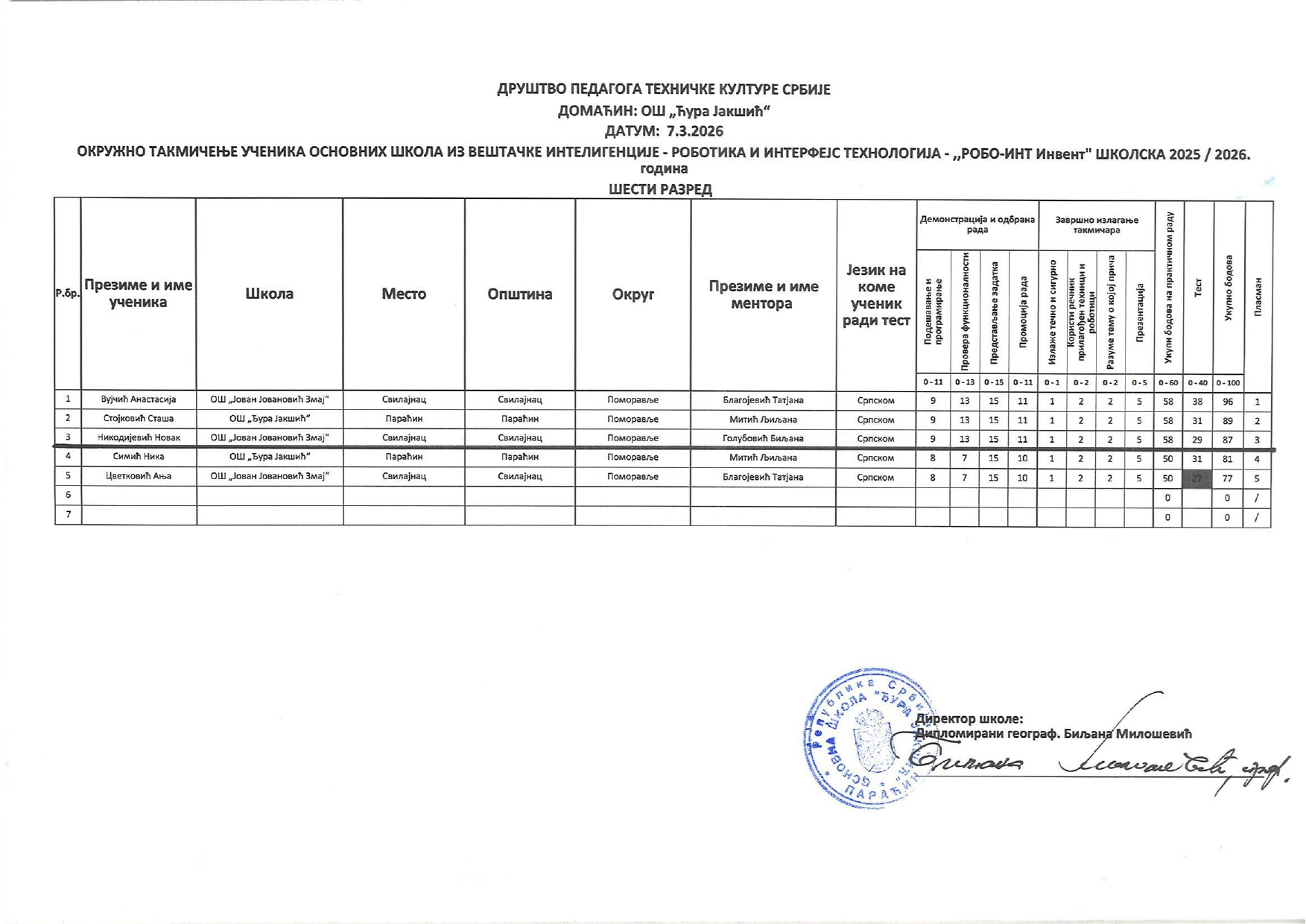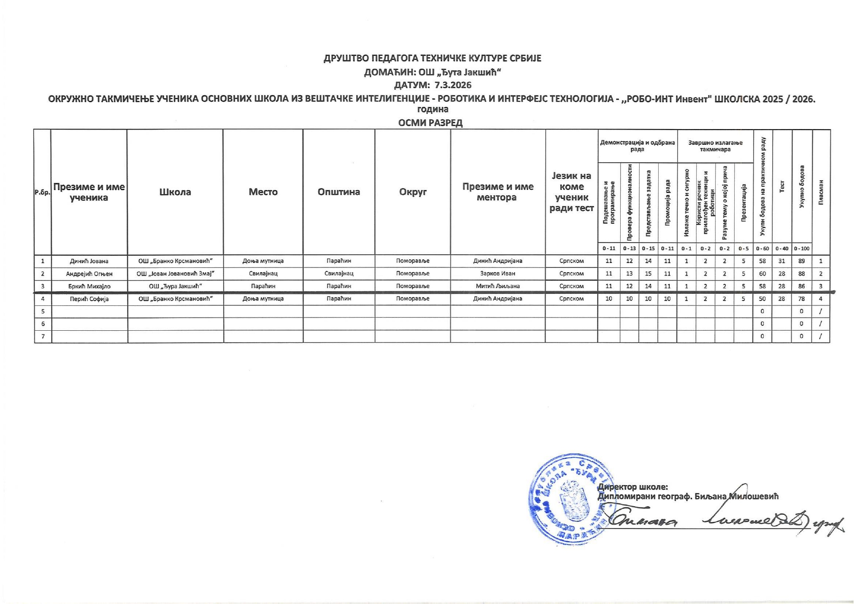 Резултати са окружног нивоа такмичења „ROBO-INT Invent“ 2025/2026 od strane Александар Јовановић | мар 7, 2026 | а 2026, о 2026, т 2026, такмичење - окружно Резултати са окружног нивоа такмичења „ROBO-INT Invent“ 2025/202607/03/2026 🔊 Читај ми У наставку можете погледати резултате са Окружног нивоа такмичења „ROBO-INT invent“.