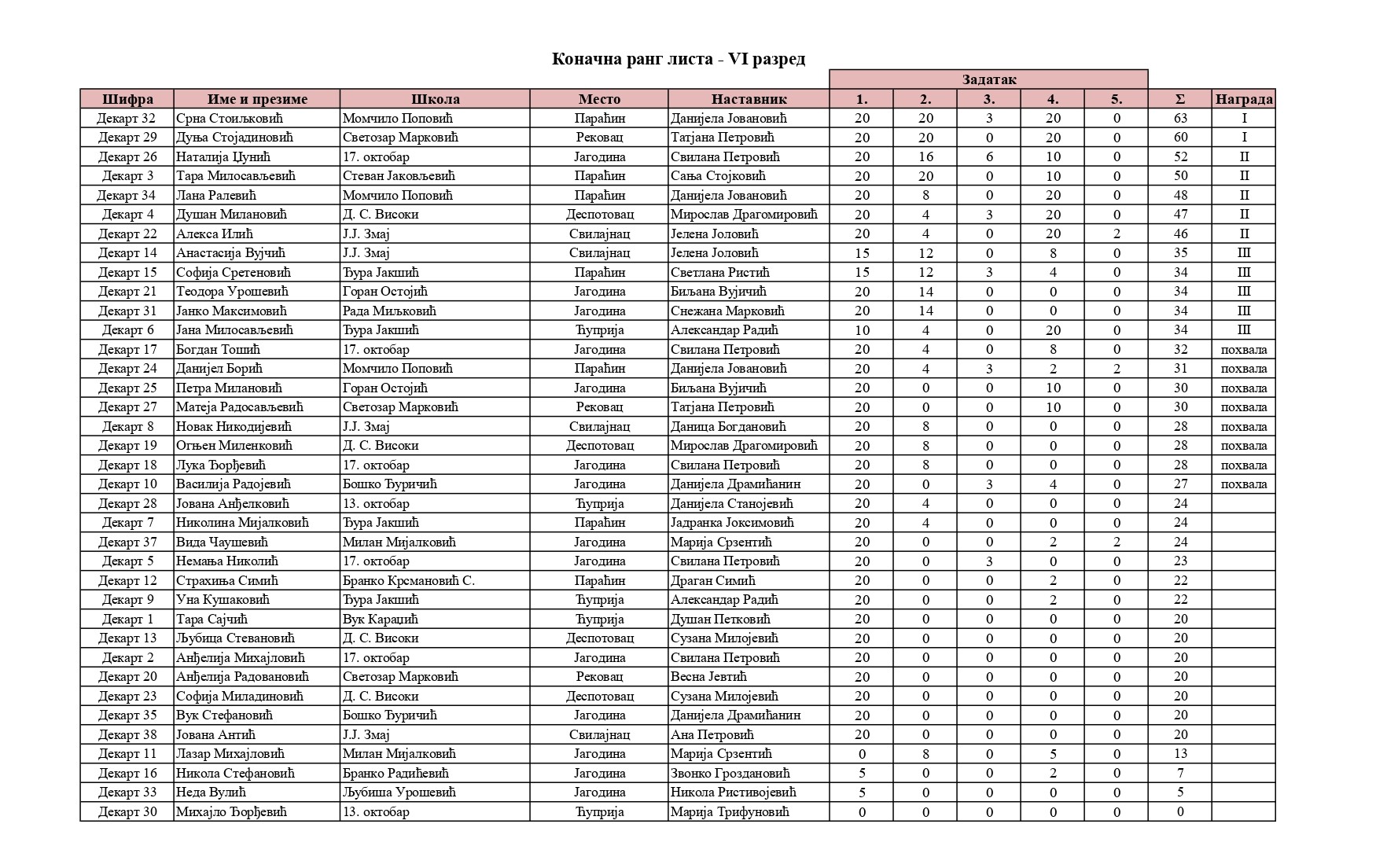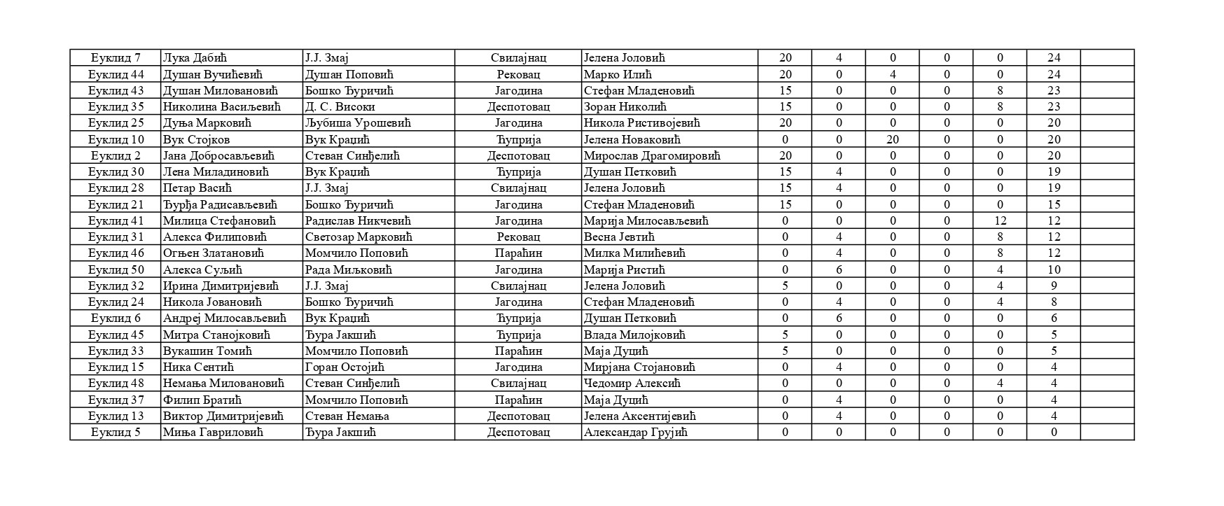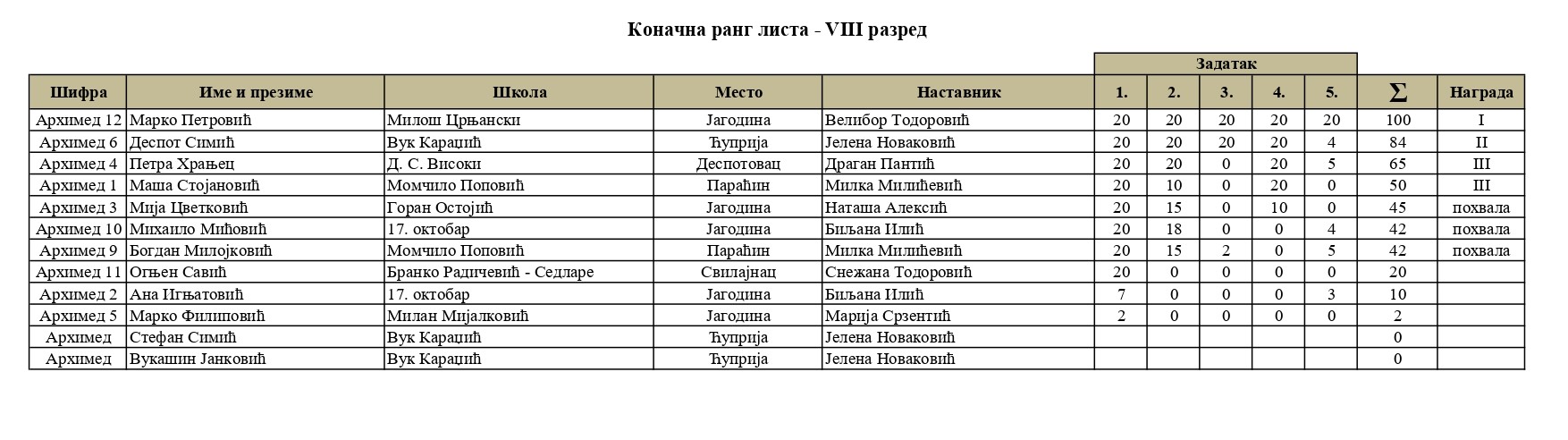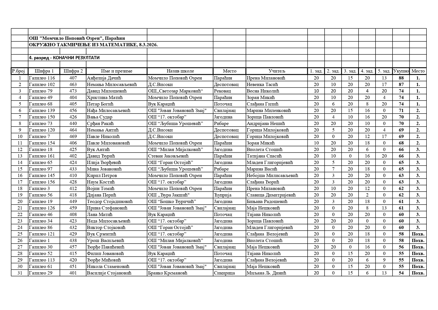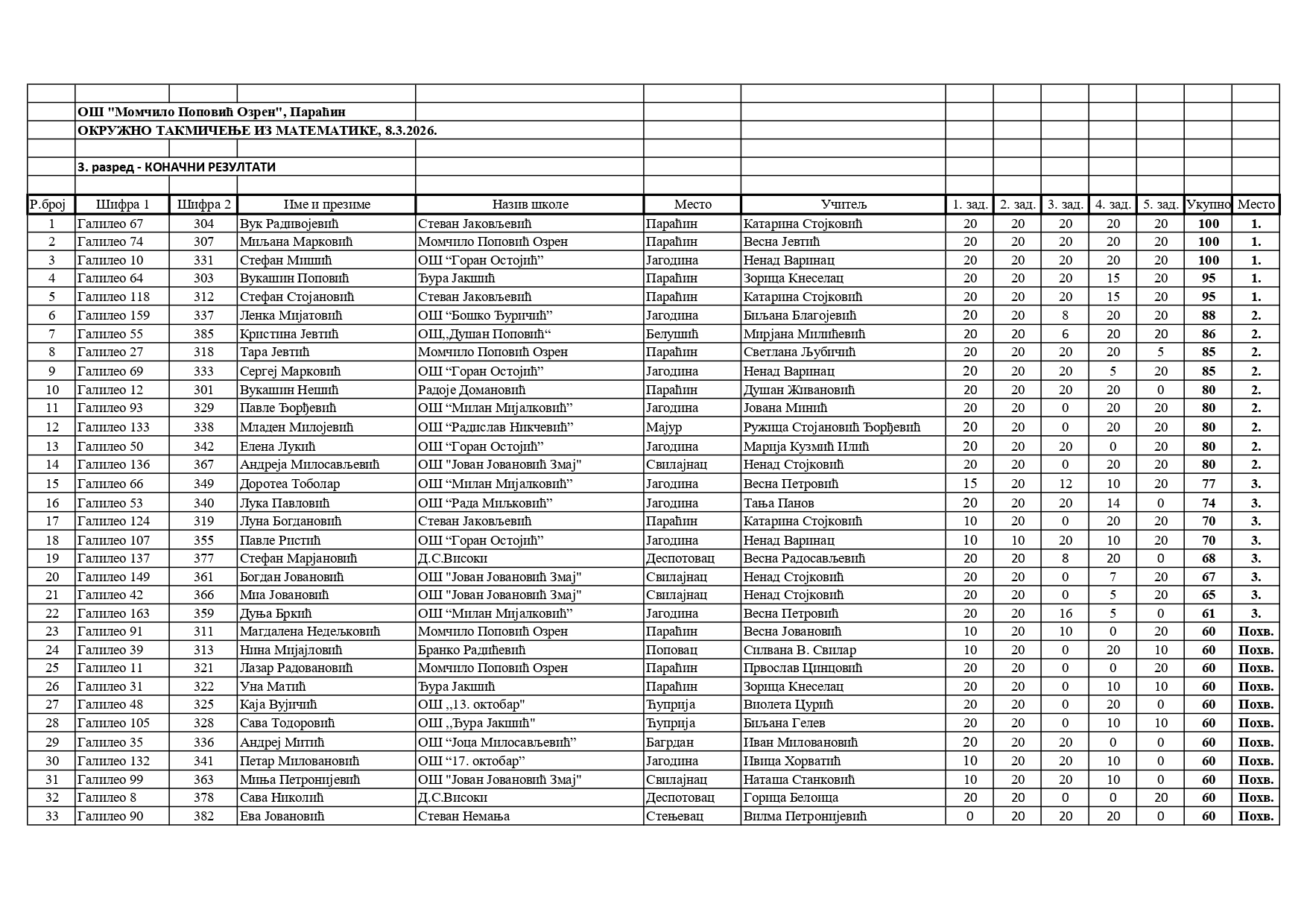 Резултати са Окружног такмичења из математике 2025/2026 od strane Александар Јовановић | мар 8, 2026 | а 2026, о 2026, т 2026, такмичење - окружно Резултати са Окружног такмичења из математике 2025/202608/03/2026 🔊 Читај ми У наставку можете погледати резултате са Окружног такмичења из математике.