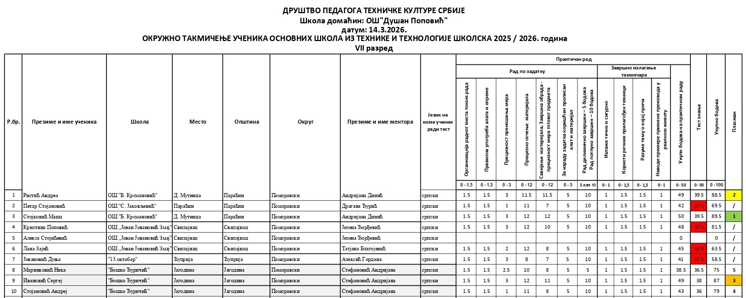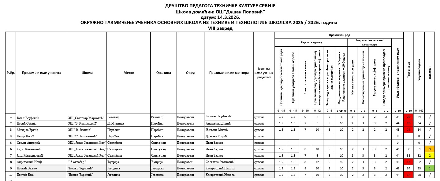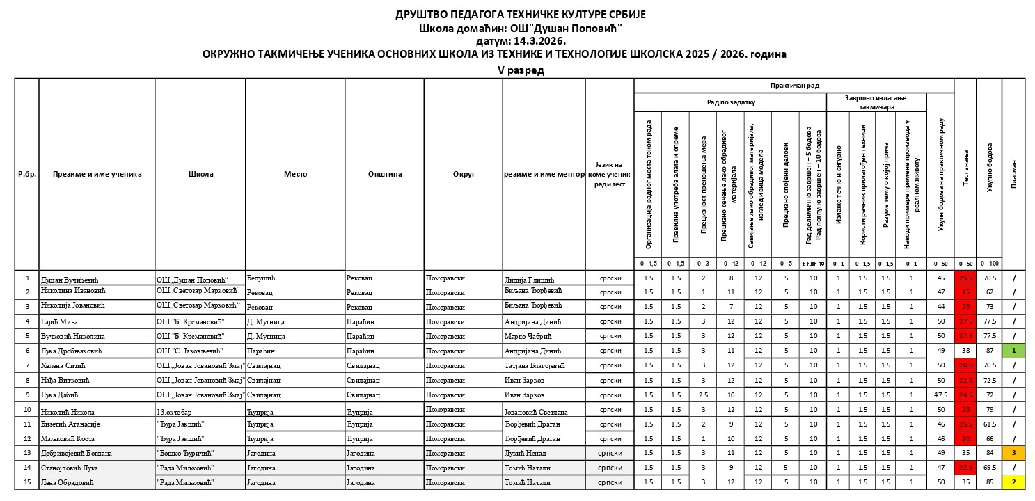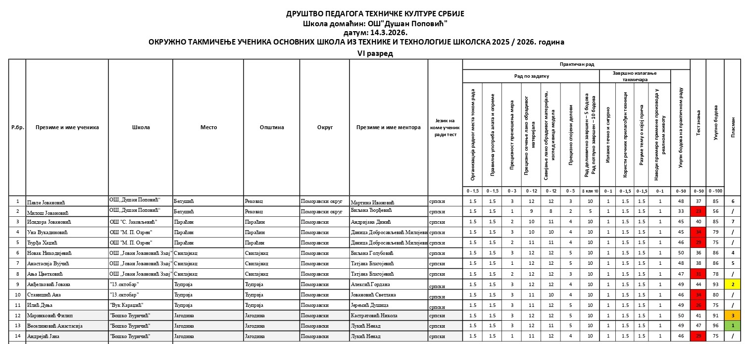 Резултати са Окружног такмичења из технике и технологије 2025/2026 od strane Александар Јовановић | мар 14, 2026 | а 2026, о 2026, т 2026, такмичење - окружно Резултати са Окружног такмичења из технике и технологије 2025/202614/03/2026 🔊 Читај ми У наставку можете погледати резултате са Окружног такмичења из технике и технологије.