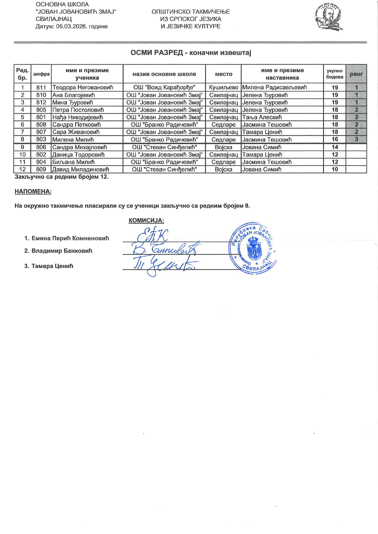 Резултати са Општинског такмичења из српског језика и књижевности 2025/2026 od strane Александар Јовановић | мар 5, 2026 | а 2026, о 2026, т 2026, такмичење - општинско Резултати са Општинског такмичења из српског језика и књижевности 2025/202605/03/2026 🔊 Читај ми У наставку можете погледати резултате са Општинског такмичења из српског језика и књижевности