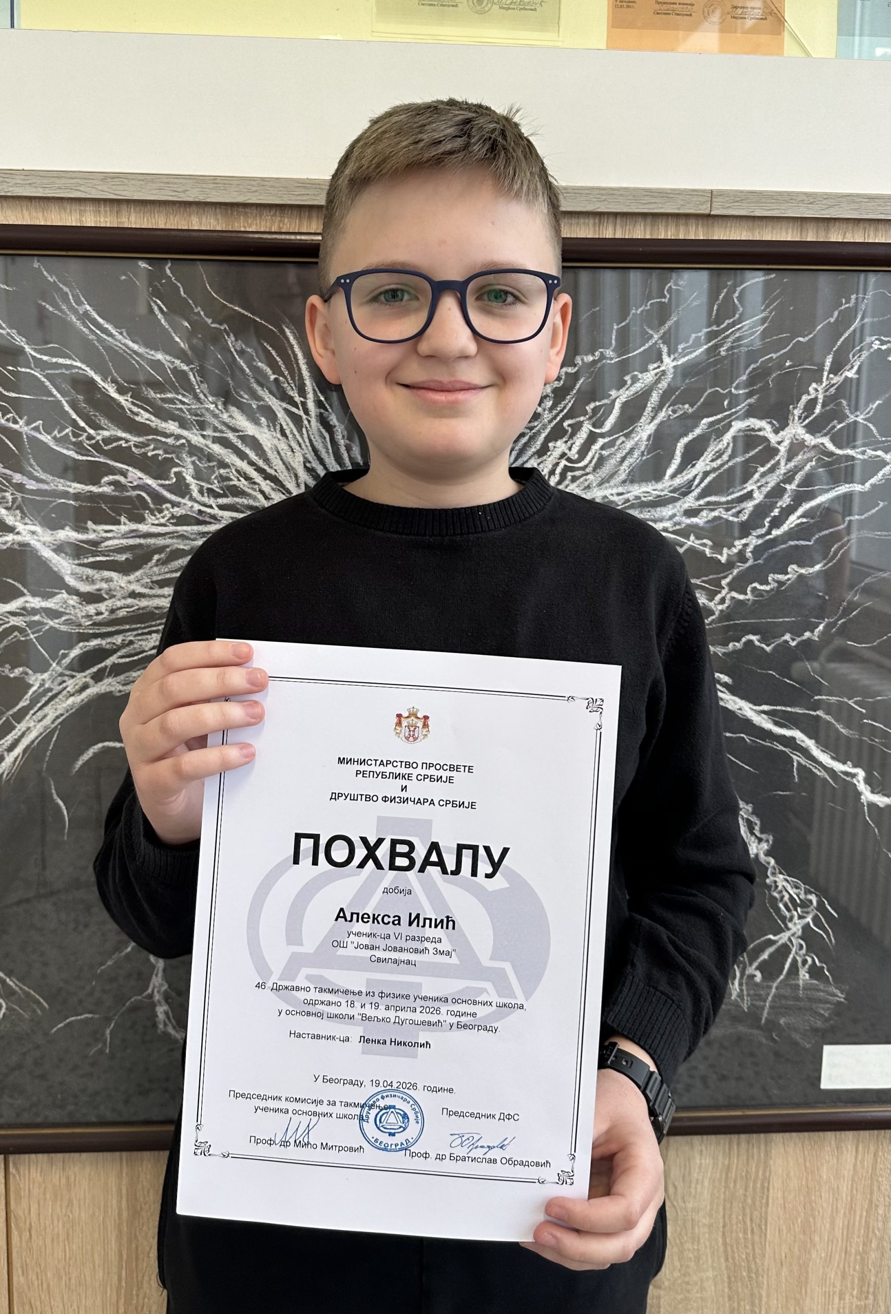 На 46. Државном такмичењу из физике одржаном од 18-19.4.2026. у ОШ “ Вељко Дугошевић” у Београду у конкуренцији око 400 шестака, нашу школу представљали су: Алекса Илић, Анастасија Вујичић и Лука Унгуреану. Алекса Илић освојио је ПОХВАЛУ! Meнтор ученика је професор физике Ленка Николић. Поред израде задатака високог нивоа, били су ту нова познанства и дружење ученика као и сусрети колега физичара ментора и размена искустава о раду са даровитом децом. Браво Млади физичари!