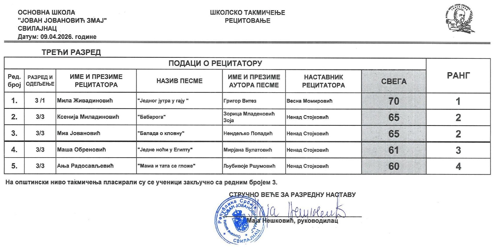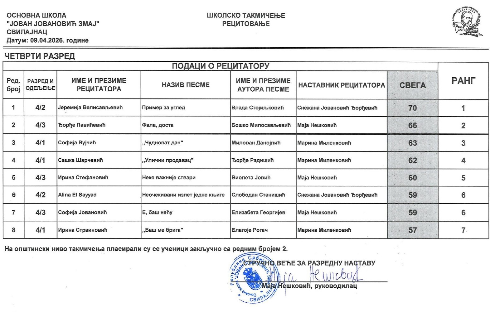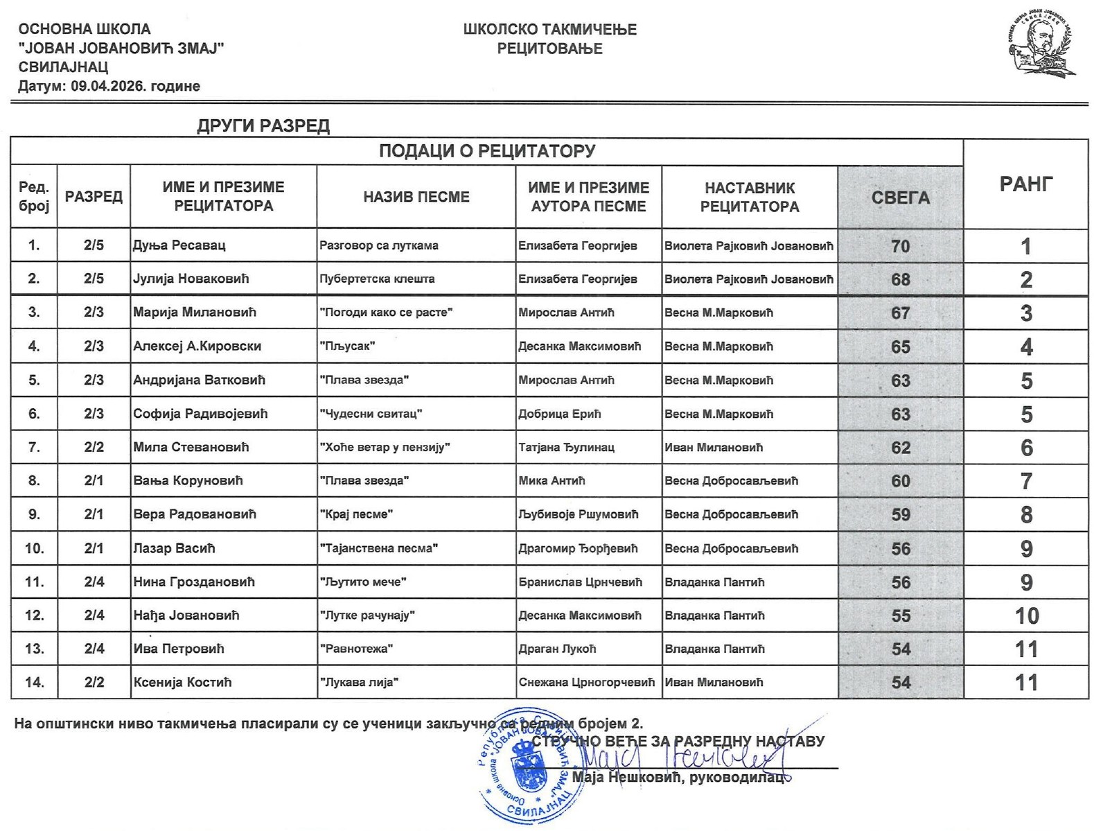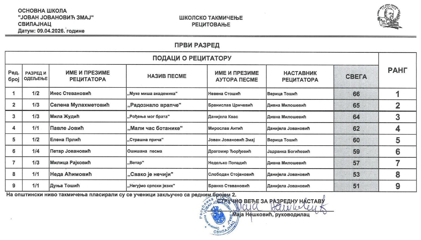 Резултати са Школског такмичења у рецитовању ученика од 1. до 4. разреда 2025/2026 od strane Александар Јовановић | апр 14, 2026 | а 2026, о 2026, т 2026, такмичење - школско Резултати са Школског такмичења у рецитовању ученика од 1. до 4. разреда 2025/202614/04/2026 🔊 Читај ми У наставку можете погледати резултате са Школског такмичења у рецитовању ученика од 1. до 4. разреда.
